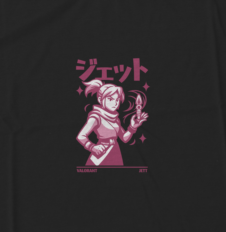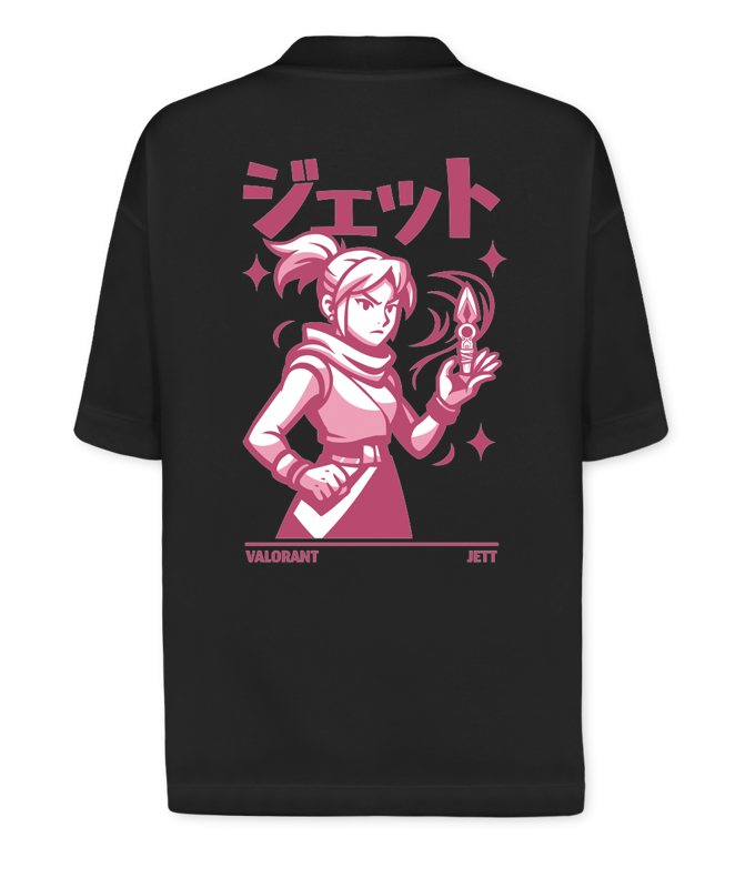 Camiseta Oversized Jett - Valorant — veloz, ousada e com muito estilo, assim como a duelista mais icônica do jogo. Ilustração detalhada da Jett nas costas e seu nome em japonês na frente, trazendo um visual autêntico e cheio de atitude. Perfeita pra quem joga leve, rápido e letal. Tecido em 100% Algodão. Modelo Oversized.
