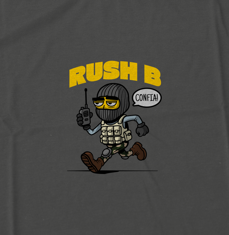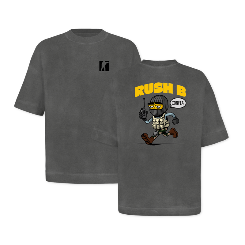Camiseta Oversized Boxy Rush B — pra quem vive no ritmo acelerado dos rounds de CS. Estampa nas costas que grita a call mais icônica do jogo, perfeita pra players que atacam sem medo e vestem estilo dentro e fora do match. Tecido em 100% Algodão. Modelo Oversized Boxy. (MODELO QUADRADO)